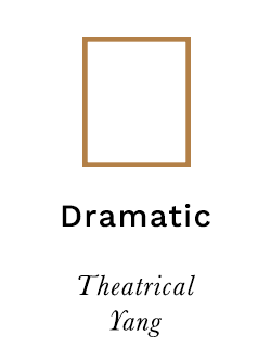 Remember, the characteristic features of the dramatic style essence are straightness, narrowness, and angularity. And the themes that this essence communicates are boldness, danger, exoticism, poise, dignity, and extravagance.